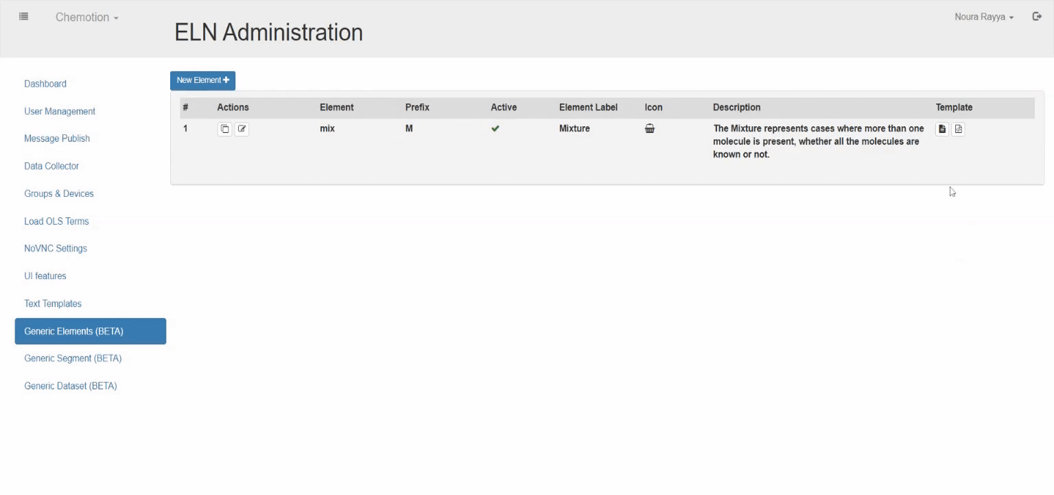By default Chemotion ELN contains five elements: samples, reactions, wellplates, screens, and research plans. Optionally, generic elements can be added by the administration.